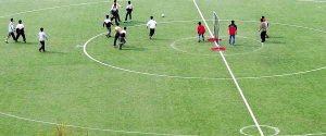 15日上午,在一所校園操場(chǎng)上,記者見(jiàn)識(shí)了一場(chǎng)別具一格的中置足球比賽。只見(jiàn)10多名運(yùn)動(dòng)員在外圍直徑30多米的圓圈內(nèi),圍著滾動(dòng)的足球時(shí)而防守,時(shí)而狂奔發(fā)起進(jìn)攻,一名隊(duì)員帶球快跑犯規(guī),裁判員立即吹響口哨,另一隊(duì)員發(fā)了一記角球,將球踢向中場(chǎng),掀起激烈的爭(zhēng)奪。守門(mén)員得球后,轉(zhuǎn)身一拋,球即進(jìn)入對(duì)方防區(qū),激烈戰(zhàn)火再次燃起……在10多分鐘的比賽中,雙方分別進(jìn)球5個(gè)和6個(gè),比賽結(jié)束時(shí),隊(duì)員們和觀眾都還意猶未盡。徐大從告訴記者,中置足球進(jìn)攻時(shí)出界球少,活動(dòng)的連續(xù)性好,有效對(duì)抗的機(jī)會(huì)多,這就使得體能較差的學(xué)生也能夠享受到足球運(yùn)動(dòng)的快樂(lè)。