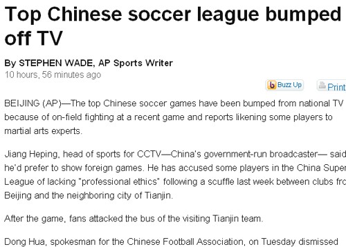 美聯(lián)社文章稱,中國足球的頂級聯(lián)賽已經(jīng)被“踢出”國家電視臺的節(jié)目單,因?yàn)樽罱舆B不斷的球場暴力,在媒體報道中甚至被稱作“武術(shù)選手”。文章援引了央視體育頻道總監(jiān)江和平的說法稱,他更希望播出外國的體育節(jié)目!白罱谐(lián)賽非常混亂,有一些球員缺乏職業(yè)素質(zhì),”他指的是上周北京國安和天津泰達(dá)隊(duì)的比賽中,兩隊(duì)球員爆發(fā)了群毆事件,賽后一些球迷還襲擊了客場作戰(zhàn)的天津隊(duì)的大巴。