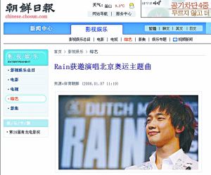 據(jù)前日的《朝鮮日報(bào)》報(bào)道稱,韓國藝人Rain(鄭智熏)獲邀演唱北京奧運(yùn)主題曲。朝鮮日報(bào)報(bào)道稱:“據(jù)悉,北京奧委會(huì)2007年曾向Rain發(fā)出邀請,希望他能夠演唱奧運(yùn)主題曲!璕ain欣然接受了邀請,目前正在與北京奧委會(huì)(注:應(yīng)為北京奧組委)方面談具體事宜。”
