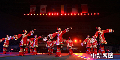 二00八年“全球通”女子摔跤世界杯在山西省城濱河體育中心舉行。山西藝術(shù)家熱情地為體育健將們帶來(lái)精彩歌舞,使賽場(chǎng)添加幾許短暫輕松。張?jiān)?攝
