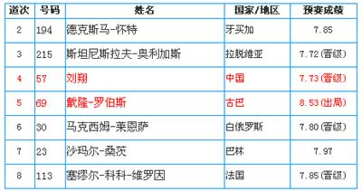 道次上,劉翔被分在第4道,該小組共有7名選手,第1道沒有選手參賽,旁邊的第5道就是最大競爭對手古巴名將羅伯斯(Dayron Robles)。第2道是牙買加選手德克斯馬-懷特,第3道也是牙買加選手斯坦尼斯拉夫-奧利加斯。分列6、7、8道的是白俄羅斯選手馬克西姆-萊恩薩、巴林選手沙瑪爾-桑茨和法國選手塞繆爾-科科-維羅因。