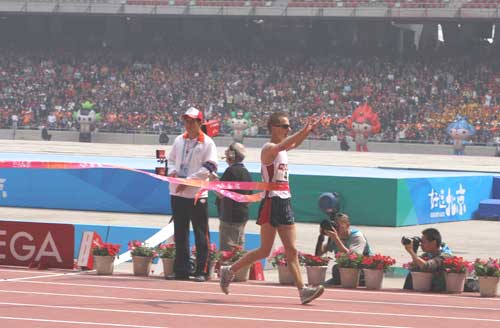 澳大利亞選手扎里德-塔蘭(Jared Tallent)沖過終點線瞬間。(圖片來源于北京奧運官網(wǎng))