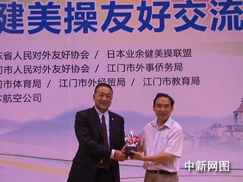 圖為江門市政府與日本業(yè)余健美操聯(lián)盟交換紀念品。