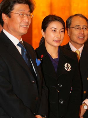 日本工作人員爭相與跳水皇后郭晶晶合影留念。