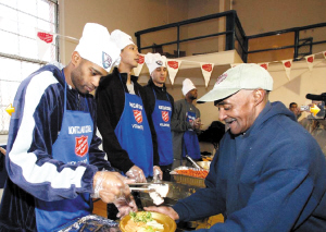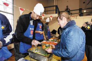 昨天,易建聯(lián)(左圖左一)和卡特、哈里斯等籃網(wǎng)隊員一起來到新澤西的一家教堂,在感恩節(jié)到來之際,向當(dāng)?shù)厣鐓^(qū)貧困居民分發(fā)食品。在活動現(xiàn)場,易建聯(lián)身著便裝頭戴一頂繡有籃網(wǎng)標(biāo)志的廚師帽發(fā)放食物,整個活動過程中易建聯(lián)始終面帶微笑,并和獲贈食物的居民親切交談。