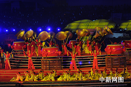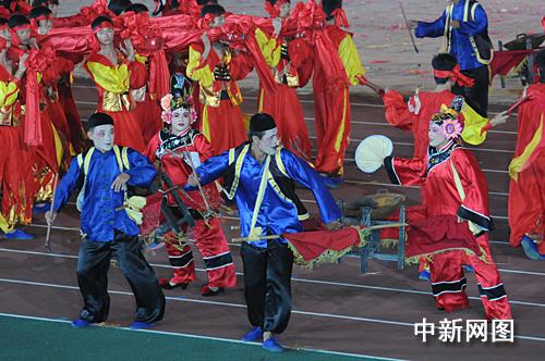 在運(yùn)動(dòng)員入場(chǎng)式后,以“歡樂(lè)農(nóng)運(yùn)•親情海峽•和諧中華”為主題的大型文體表演《大地情飛揚(yáng)》正式開(kāi)始。整臺(tái)節(jié)目具有濃郁的閩南地域文化特色,為觀眾獻(xiàn)上了一道氣勢(shì)磅礴的視覺(jué)大餐。