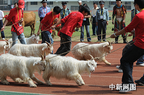 “今早明明還很乖,我還帶它在場地里散步吃草呢。”滿頭大汗的志愿者小陳終于“拽”住了還在“意猶未盡”到處亂蹦的山羊。據(jù)小陳介紹,這些是本應(yīng)在女子搏克頒獎式上作為獎品出場的羊。“估計它們沒見過什么大場面,又被這么多相機的閃光嚇得要命,再加上今早天氣很熱,所以就‘造反’了!