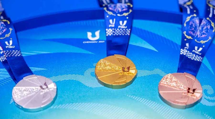 獎牌形態(tài)呈現(xiàn)出不規(guī)則的圓形,以致敬太陽與青春;獎牌會徽面特設(shè)“文明時光墻”,刻畫了從象形文字“蜀”到現(xiàn)代漢字“雄起”等不同時期的中國文字