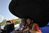 18日上午,亞運(yùn)會(huì)龍舟項(xiàng)目在增城開賽,戶外工作的攝影記者頭戴巨型帽子遮陽,以便更好的工作。