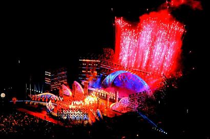 與傳統(tǒng)模式不同的是,六城會(huì)閉幕式移師江城最大的市民親水平臺(tái)漢口江灘,根據(jù)奧運(yùn)“五環(huán)”的色彩,江灘被分為五大活動(dòng)區(qū)域,主會(huì)場(chǎng)的歌舞表演為觀眾展現(xiàn)了一幅清秀雋永的荊楚山水畫卷,在其它四個(gè)區(qū)域,市民進(jìn)行腰鼓、巴山舞、太極拳、秧歌舞、街舞、輪滑等14個(gè)大類30個(gè)項(xiàng)目的全民健身活動(dòng)。