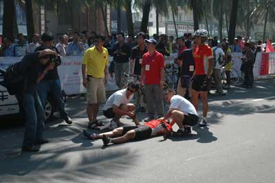 昨天,由海馬汽車贊助的2007環(huán)海南島國際公路自行車賽結(jié)束第三賽段爭奪,雖然本賽段比較平,難度不大,但卻意外發(fā)生中國隊(duì)選手惠國與攝影記者碰撞事件。記者昨天采訪了解到,惠國身體多處擦傷,退出比賽的可能性非常大。