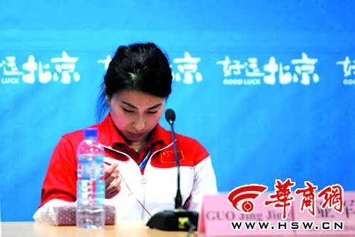 主持人宣布新聞發(fā)布會(huì)開始后不久,坐在臺(tái)上的郭晶晶開始低著頭自顧自地忙碌著什么,剛開始記者還以為她是在處理自己的手指甲,可隨后發(fā)現(xiàn)她手里有一根穿東西常用的紅繩。隨著新聞發(fā)布會(huì)的推進(jìn),郭晶晶顯得更為專心和忙碌。相比另兩位獲獎(jiǎng)?wù)邔W⒂谛侣劙l(fā)布會(huì)的進(jìn)行和記者的提問,郭晶晶連往臺(tái)下看都不看一眼,這也是本報(bào)記者參加體育賽事新聞發(fā)布會(huì)經(jīng)歷中從沒有遇到過的情景。