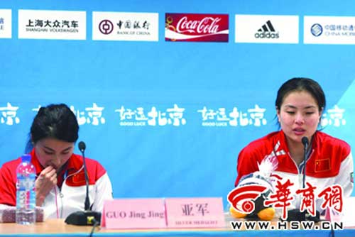 前晚決賽結(jié)束后,在運(yùn)動(dòng)員必須經(jīng)過的混合采訪區(qū),郭晶晶穿著泳衣出現(xiàn)在記者面前。很顯然,相比別的隊(duì)員穿戴整齊,郭晶晶更有理由早些離開。當(dāng)有記者問到誰可能是郭晶晶在北京奧運(yùn)會(huì)上的有力競(jìng)爭(zhēng)者時(shí),郭晶晶沒有說到隊(duì)友——剛剛獲得金牌的吳敏霞,而是答道:“俄羅斯的帕卡琳娜和加拿大那個(gè)胖子(哈特莉)!庇蒙眢w特征來指代別國(guó)運(yùn)動(dòng)員,顯然缺乏禮貌!扒懊婺阋舱f了,新跳板對(duì)你有些影響。就你今晚的問題來說,新跳板影響有多大呢?”就此前郭晶晶說自己不適應(yīng)水立方新跳板的說法,新聞發(fā)布會(huì)上有記者希望她介紹更為詳細(xì)的情況。“你具體說說我出了什么問題?難道我出了什么問題嗎?我覺得我表現(xiàn)得還可以。跳板是死的,人是活的,人總是要去適應(yīng)跳板的。”郭晶晶如此回答。