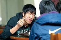 劉翔迅速返回公寓,套上帽衫,陽光很燦爛,劉翔很愜意,他“大搖大擺”、仰著頭,輕哼著流行歌走向食堂。“來了。 币蛔哌M二樓田徑隊的飯?zhí),立即有廚師倍兒親切地招呼他,劉翔笑著說“餓了”。跨欄組幾個人坐到東北角,這是他們的“老地方”。接著劉翔和大伙兒一起排隊,盛上青菜、棒骨、肉末燉粉條、炒雞蛋和白米飯,又拿了個柚子。