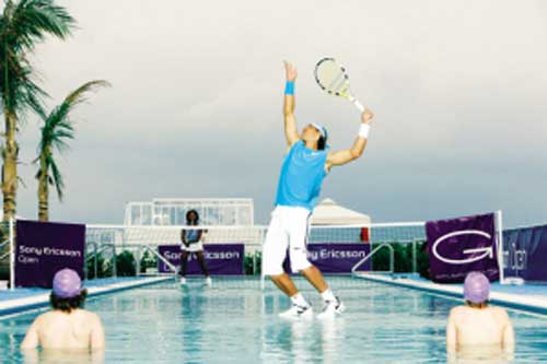索尼愛立信公開賽即將大幕重開,網(wǎng)壇兩位巨星級(jí)人物納達(dá)爾和小威廉姆斯有幸親歷了一番別樣的打球體驗(yàn)。本月24日,他們?cè)谶~阿密當(dāng)?shù)谿ansevoort South 酒店的屋頂上打了一場(chǎng)別樣的網(wǎng)球賽,更有意思的是他們“站”在水上打球。