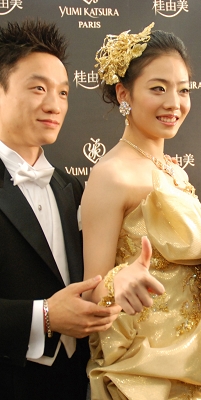 這件由桂由美打造的價(jià)值3000萬(wàn)元的黃金婚紗,是婚紗界的頂級(jí)藝術(shù)品。全世界僅有兩件,另外一件已經(jīng)被日本國(guó)立博物館收藏。完成造型,穿上婚紗,當(dāng)兩人手挽手出現(xiàn)在大堂時(shí),無(wú)數(shù)閃光燈頓時(shí)閃起。此時(shí)的楊威有些緊張,抿著嘴擠出一絲笑容,倒是楊云顯得自然很多,一手拿著紅色禮花,大方地向鏡頭露出迷人的微笑。過(guò)了10分鐘,楊威才從緊張的情緒中舒緩過(guò)來(lái),左手搭在楊云的肩上,兩人一起擺著POSE。