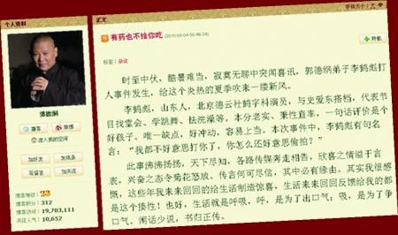 8月4日凌晨,針對(duì)德云社弟子打人事件,郭德綱在其博客上發(fā)表一篇《有藥也不給你吃》的文章,字句相當(dāng)犀利。網(wǎng)友看后紛紛調(diào)侃:“天不怕,地不怕,就怕流氓有文化!”