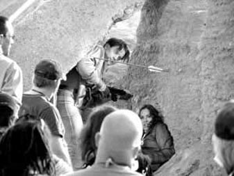 昨日(18日)拍攝的這場戲講的是布蘭登·弗雷澤與瑪麗亞·貝羅遭到敵人的追殺,二人在沙漠中一邊躲避弓箭的襲擊,一邊還擊,雕翎箭與短槍的交火頗有些“關公戰(zhàn)秦瓊”的味道。布蘭登扮演的里克一身牛仔裝扮,手拿一把短槍,依舊延續(xù)了前兩集中的扮相,而瑪麗亞扮演的艾芙琳則穿著深棕色短款夾克,足蹬馬靴,手持一把手槍。導演羅伯·科恩一聲“開始”后,他們在巖石后緊張地躲避著敵人的追趕,此時,一支雕翎箭射來,擦著布蘭登的右臂射進土墻,布蘭登立即伏地掩護瑪麗亞,并迅速用槍還擊,而瑪麗亞也起身與他并肩作戰(zhàn)。盡管這個鏡頭在片中只出現(xiàn)短短的10秒鐘,但科恩導演還是讓兩位主演拍了3遍。