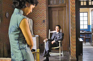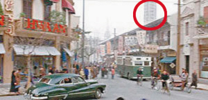 幕后:為了完整重現(xiàn)《色,戒》中30年代場景,李安不惜花了3000萬人民幣在上海搭建了一條完整的“南京西路”,道路兩旁盡是2、3層樓的建筑,共蓋了大小180家商店。據(jù)悉,原著小說中,曾出現(xiàn)店家的陳年照片,李安就根據(jù)這些,再對照真實史料,仔細考究搭建,就連櫥窗內(nèi)的商品也以真品放置。李安對美工的要求幾乎到了苛刻的地步,連一只杯子都要和當年一模一樣。但百密一疏,背景中的高樓影子,本應該在后期制作中用電腦刪去,卻疏忽了。