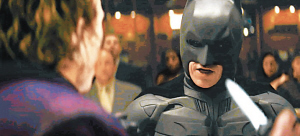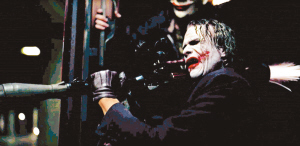 對(duì)于希斯·萊杰的加盟,外界普遍認(rèn)為他比前任小丑的扮演者杰克·尼科爾森更具看頭。果然首段預(yù)告片中他的表現(xiàn)就令人十分驚艷。故事講述葛咸城出現(xiàn)一位自稱(chēng)小丑的瘋狂罪犯,利用大殺傷力武器搶劫銀行,令警方束手無(wú)策,驚動(dòng)蝙蝠俠出手相助,最后被捕入獄。出獄后的小丑公然向蝙蝠俠挑戰(zhàn),片中有不少兩人街頭對(duì)決和他亂槍掃射的場(chǎng)面,正邪之戰(zhàn)最終演變成私人恩怨。而扮演小丑的希斯·萊杰無(wú)論舉手投足,甚至說(shuō)話(huà)聲線(xiàn)均邪氣十足,配上其恐怖化妝及歇斯底里的笑聲,實(shí)在叫人不寒而栗。片中小丑一句口頭禪“Why So Serious?”(何需如此認(rèn)真?),更成為了新一批電影海報(bào)的標(biāo)語(yǔ)。