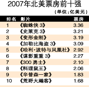 尚有數(shù)天便告別2007年,是時(shí)候?yàn)楹萌R塢電影發(fā)一張票房成績(jī)表。今年,《蜘蛛俠3》以3.36億美元(約合25億人民幣)成為北美最賣(mài)座電影。綜觀今年電影票房,仍然是特技片與動(dòng)畫(huà)片的天下,由香港動(dòng)畫(huà)師許誠(chéng)毅執(zhí)導(dǎo)《史萊克3》領(lǐng)跑動(dòng)畫(huà)片,以3.21億美元排名第二。