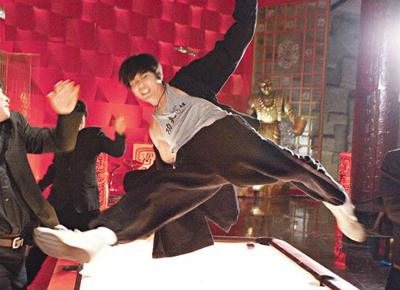 中新網(wǎng)1月16日電 周杰倫在新片《大灌籃》中,單獨與80名壯漢惡拚連場,一幕凌空飛腿后落地擺出金雞獨立姿勢的場面,連動作導演程小東也不禁大贊。