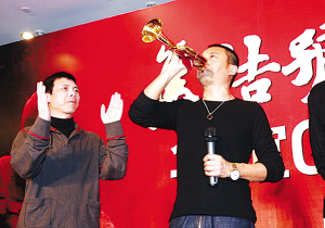 由于要忙于拍攝,參與慶功宴的《集結(jié)號(hào)》演員并不全,除了張涵予,還有任泉、廖凡、李乃文和付亨幾個(gè)“九連”的兄弟到場(chǎng)。“連長(zhǎng)”谷子地一一解釋了其他演員不能到場(chǎng)的原因,說到鄧超時(shí),現(xiàn)場(chǎng)還特別播放了他為這次慶功宴錄制的一段VCR以及他專門托人送來的一只鍍金的集結(jié)號(hào)。面對(duì)這只在片中讓谷子地苦等了幾十年的集結(jié)號(hào),張涵予還沒等導(dǎo)演仔細(xì)端詳,便“搶”過來吹了起來,霎時(shí)全場(chǎng)響起了嘹亮的號(hào)聲。 辛 文