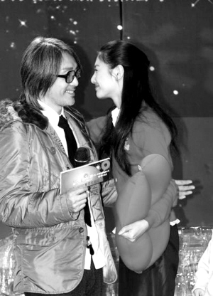 最后,兩個(gè)小演員徐嬌和黃蕾深深獻(xiàn)吻,周星馳高興地半跪在地“接受禮物”,卻因?yàn)榕_(tái)下的攝影記者找不到角度而“下跪受吻”好幾次。