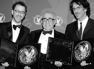 2007年導(dǎo)演工會(huì)獎(jiǎng)上周日揭曉,其中電影部分的“最佳導(dǎo)演”給了《老無所依》的導(dǎo)演科恩兄弟,去年這個(gè)獎(jiǎng)的最佳導(dǎo)演馬丁.斯科賽斯為他們頒發(fā)了這一獎(jiǎng)項(xiàng)。其他4位獲得提名的導(dǎo)演:分別是《血色黑金》的保羅.托馬斯.安德森、執(zhí)導(dǎo)《英雄不問出處》的托尼.吉爾羅伊、執(zhí)導(dǎo)《荒野生存》的肖恩.潘《荒野生存》以及《潛水鐘與蝴蝶》的導(dǎo)演朱利安.施納貝爾。導(dǎo)演工會(huì)獎(jiǎng)由導(dǎo)演工會(huì)的一萬多名成員投票評(píng)選,在過去的59屆中有53次與奧斯卡最佳導(dǎo)演結(jié)果吻合!趼?dòng)?