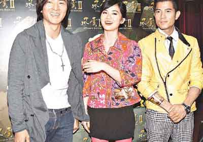 中新網(wǎng)3月19日電 鄭伊健與郭富城在電影《風(fēng)云Ⅱ》記者會(huì)上,一同在臺(tái)中央落座,凸顯一哥地位。