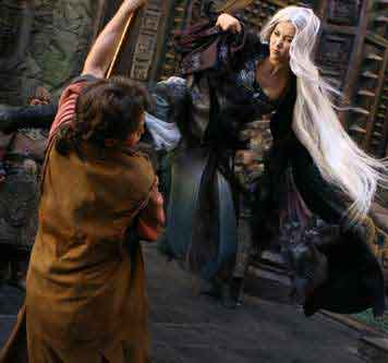 李冰冰飾演冷血白發(fā)魔女霓裳,拍攝時(shí),要耍出“鳳舞九天”一招,最后整個(gè)身體掉在假巖而刮傷手臂和手掌,還曾半空中吊威壓飛行而傷到背部。雖然付出良多,但獲成龍大哥贊美為白發(fā)魔女的絕佳人選,李冰冰還是興奮不已。