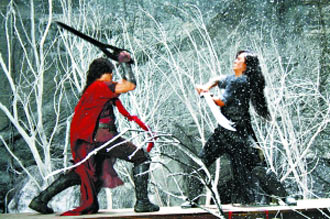 發(fā)布會當(dāng)天拍攝的是聶風(fēng)和步驚云的最后一場雪中決斗戲,這也是全片的一場重頭戲。在拍攝時還發(fā)生了一點“意外”,鄭伊健的劍不小心打到了郭富城的頭上,現(xiàn)場工作人員非常緊張,郭富城安慰大家說沒關(guān)系,沒流血,結(jié)果拍攝結(jié)束,郭富城摘掉假發(fā)后才發(fā)現(xiàn),被打到的地方竟然腫得老大,郭富城打趣道:“腫得像乒乓球,就當(dāng)迎接奧運(yùn)了!
