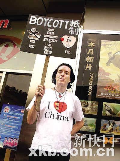 一位網(wǎng)友在他的博客中介紹了事情的經(jīng)過(guò):“在北大教書的美國(guó)人Tim Lies和他的中文翻譯日前來(lái)到位于北京北三環(huán)的華星國(guó)際影城,手舉著一個(gè)寫著‘BOY-COTT 抵制’的牌子開(kāi)始了他抵制好萊塢電影《功夫熊貓》的實(shí)際行動(dòng)。他希望中國(guó)電影不要變成第二個(gè)好萊塢。”