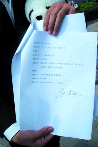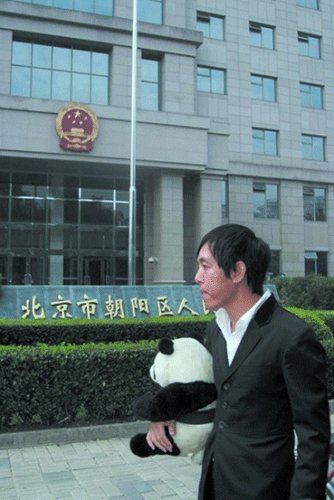 “我就不明白了,熊貓?jiān)趺磿?huì)是綠色眼睛?夢(mèng)工廠必須給我作出解釋!……”趙半狄頭頂熊貓,手拿起訴書,以及法院的受理號(hào),理直氣壯地站在朝陽區(qū)人民法院的門口,和他的委托代理人站在一起,“咔嚓”了好幾張照片,都貼進(jìn)了他的博客。