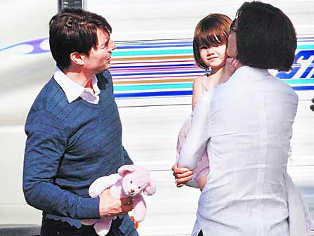 湯姆·克魯斯(左起)、舒莉和凱蒂·荷爾姆斯到片場探班。