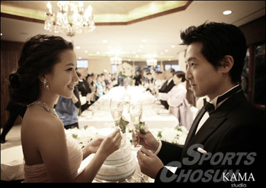 新郎樸周永畢業(yè)于漢陽大學法律系,是韓國中堅建設企業(yè)樂山集團總裁樸成寬的次子,現在首爾江南狎鷗亭洞經營美容公司。去年,金喜善經熟人介紹在一次聚會上和樸周永相識后,兩人經過一年多的甜蜜戀愛,終于修成正果。