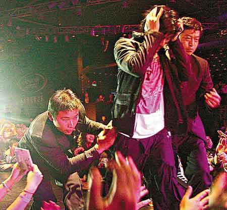 但歌迷仍未心息,保安于是與歌迷展開(kāi)一場(chǎng)拔河賽,力宏就是那條“繩索”,幾經(jīng)拉扯之后,保安才成功將力宏拉回臺(tái)上,他一臉驚慌地用手掩頭,不過(guò)專(zhuān)業(yè)的力宏驚魂未定便繼續(xù)獻(xiàn)唱,但明顯已小心地跟觀眾席保持距離,后來(lái)走近與歌迷擊掌也小心翼翼,表演完畢即由兩名保安簇?fù)黼x場(chǎng)。