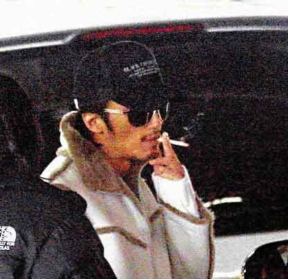 戴上墨鏡的芝身穿大衣,蹺同樣戴上黑超的霆鋒,在多名身材高大的保安開(kāi)路下離開(kāi)。霆鋒上車(chē)前急不及待叼煙狂吸,似乎急于“充電”。