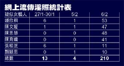 發(fā)放者先于昨日凌晨約1時30分傳出一張疑似顏穎思的淫照,直至昨午1時半,共210張淫照以zipfile(壓縮檔)形式經(jīng)電郵傳出,其中疑似鍾欣桐的照片最多,達(dá)53張(見表)。前晚開始更陸續(xù)有網(wǎng)友聲稱看過一段約32分鐘有關(guān)陳冠希與一名女藝人的短片。