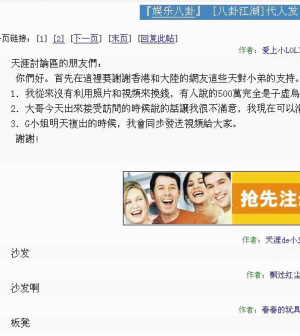 過去數(shù)日,被稱為“奇拿”的發(fā)相神秘人先后兩度以突襲式在網(wǎng)上發(fā)布逾百?gòu)垙奈雌毓饴阏,引?lái)大批網(wǎng)民通宵留守電腦前等候最新消息。前晚,有網(wǎng)友在內(nèi)地論壇發(fā)布一條預(yù)告(見上圖),稱11日阿嬌復(fù)出時(shí)將在網(wǎng)上同步發(fā)送阿嬌與陳冠希的一段性愛片段,任由網(wǎng)友觀賞。