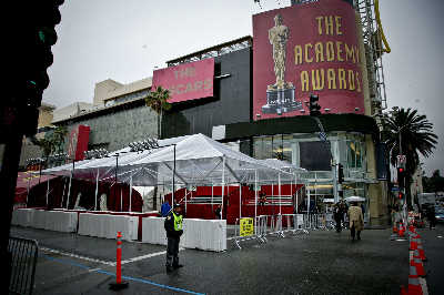 柯達(dá)劇院外星光大道上已經(jīng)搭起了遮雨棚 。