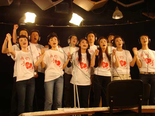 在將近10個(gè)小時(shí)的錄制過(guò)程中,所有參與的工作人員在將近五十度高溫的錄音棚內(nèi)堅(jiān)持工作,以最飽滿的熱情錄制歌曲。朱軍、董卿還都是在結(jié)束了白天的工作后在凌晨直接趕到錄音棚的,整個(gè)錄制過(guò)程到凌晨1點(diǎn)半才結(jié)束。大家都真心地希望通過(guò)這首歌曲能給災(zāi)區(qū)人民帶去些許撫慰,能夠鼓勵(lì)大家攜起手來(lái)堅(jiān)強(qiáng)面對(duì),共渡難關(guān)。