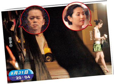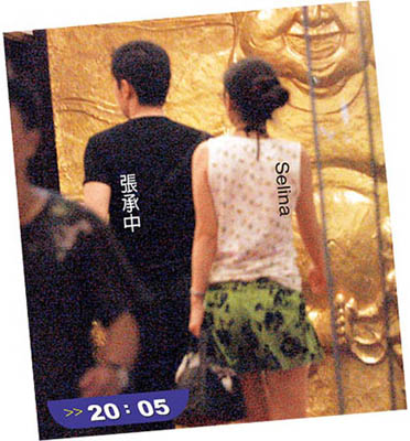 八月三十一日晚間八點,張承中開著Selina的車來到臺北市敦化南路上的“驥園川菜館”,穿著短裙白背心的Selina則從副駕駛座下車,刻意低著頭走進(jìn)餐廳,而一身黑色休閑服的張承中,將車鑰匙交給泊車小弟后,也跟著Selina走進(jìn)餐廳,一路不停盯著遠(yuǎn)方看有無狗仔車,非常謹(jǐn)慎小心。