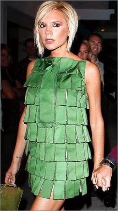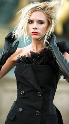 點(diǎn)評(píng):還記得《101只斑點(diǎn)狗》里的皮革愛好狂克魯拉嗎?貝嫂的黑色斜肩小禮服雖然酷味十足,看看一頭凌亂的金發(fā)和烈焰紅唇,頗有克魯拉刻薄的姿態(tài)。
