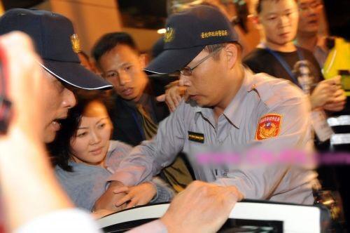 央視主播柴璐(灰衣)等媒體人員遭民眾圍堵辱罵,在警方保護(hù)下搭警車(chē)離開(kāi)。