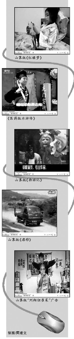 這只是近期眾多走紅網(wǎng)絡(luò)的網(wǎng)友自制影視劇中的一部。在電腦中輸入“山寨”一詞就會(huì)發(fā)現(xiàn),電視劇《水滸傳》、《西游記》,電影《大話西游》、《尋槍》、《頭文字D》,“優(yōu)樂美奶茶”、“劉翔紐崔萊”以及部分電視購(gòu)物廣告,均被推出了山寨版。