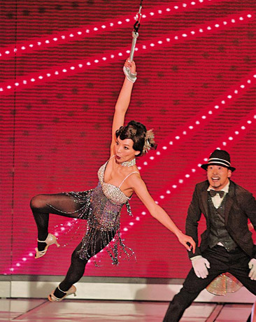 身穿超低胸舞衣的陳煒吊威亞在半空中做飛人,十分搏命。