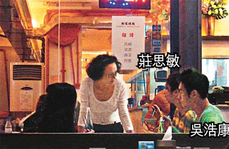 柏芝媽昨日凌晨在餐館“西環(huán)碼頭”招呼吳浩康和女友莊思敏。