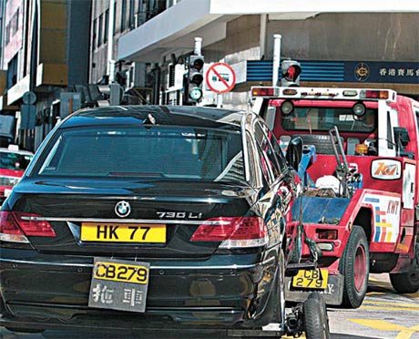 掛上紀念朱玲玲當(dāng)選港姐年份HK77車牌的寶馬,昨日也被拖車拖到寶馬車廠。