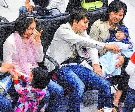 王仁甫(中)機(jī)場(chǎng)逗著哭鬧的兒子YaYa(右前),季芹(左)與女兒樂(lè)樂(lè)(左前)則陪在一旁。